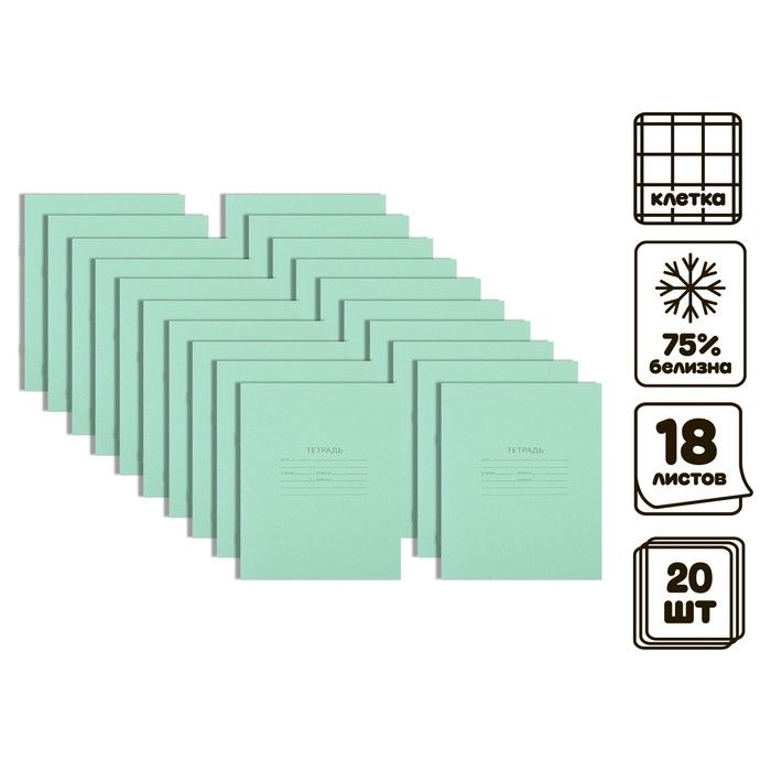 Комплект тетрадей из 20 штук, 18 листов в клетку КПК "Зелёная обложка", блок №2, 60 г/м2, белизна 75% (серые листы)