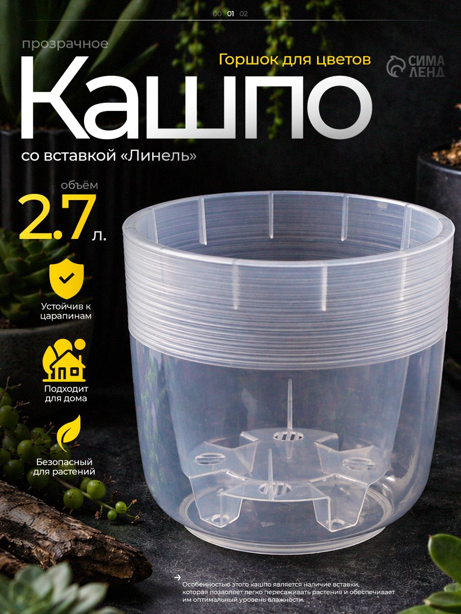 Горшок для цветов, 2,7 л, прозрачный со вставкой, пластиковое кашпо для растений и рассады