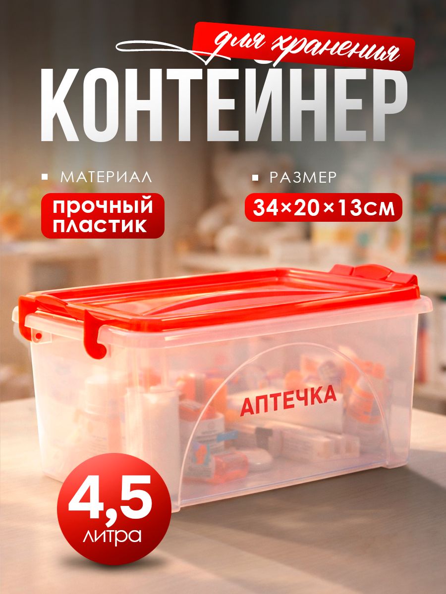 Контейнер прямоугольный, 4,5 л, аптечка, с ручками, пластик, прозрачный