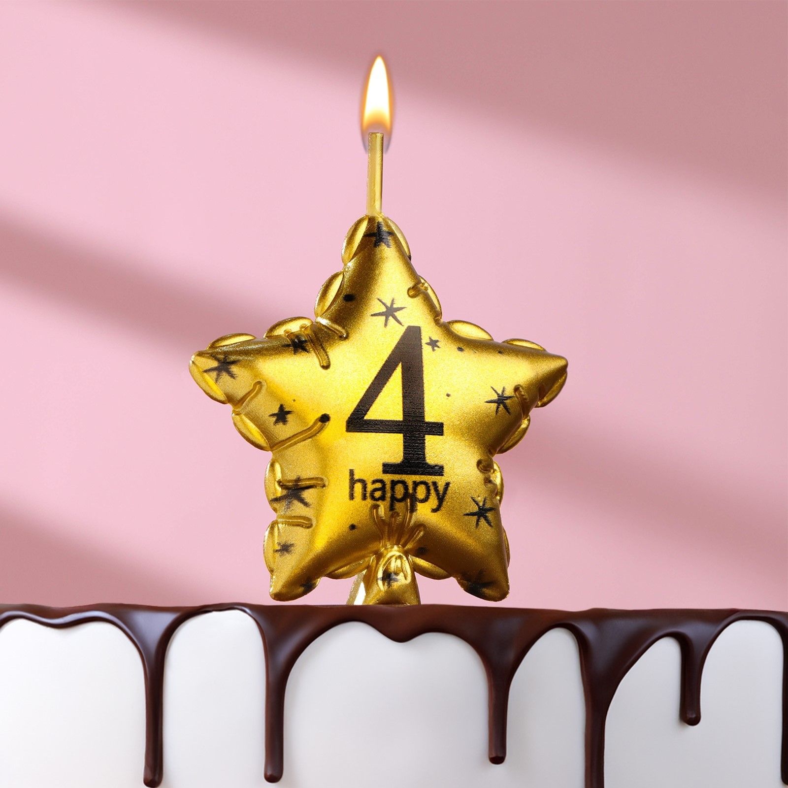 Свеча в торт на шпажке / Воздушный шарик "Звезда" / Цифра 4 / 5.5 см / Золотая