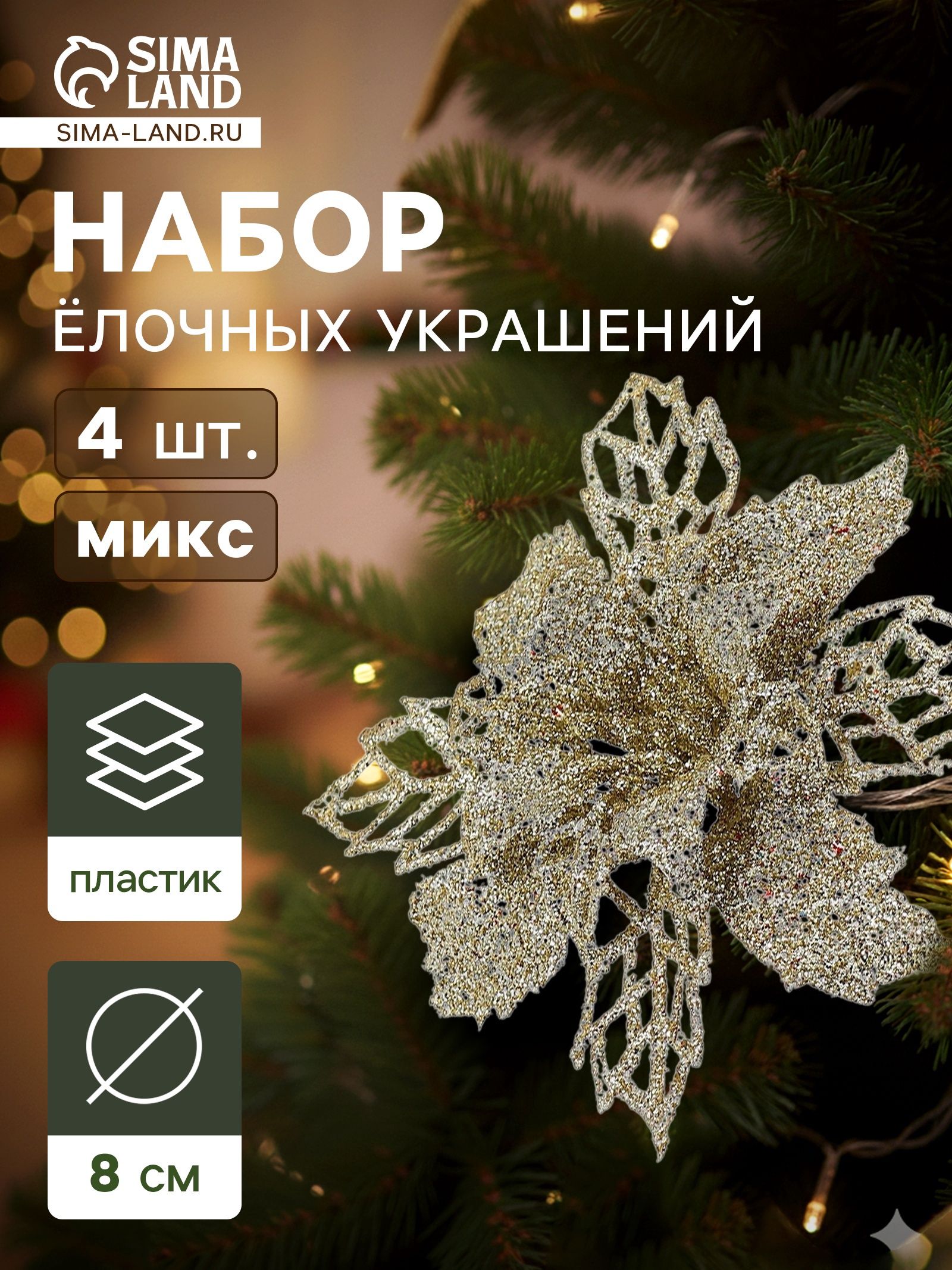 Елочные украшения новогодние Цветы на елку золотые, 8 см, 4 шт / Набор елочных игрушек для декора
