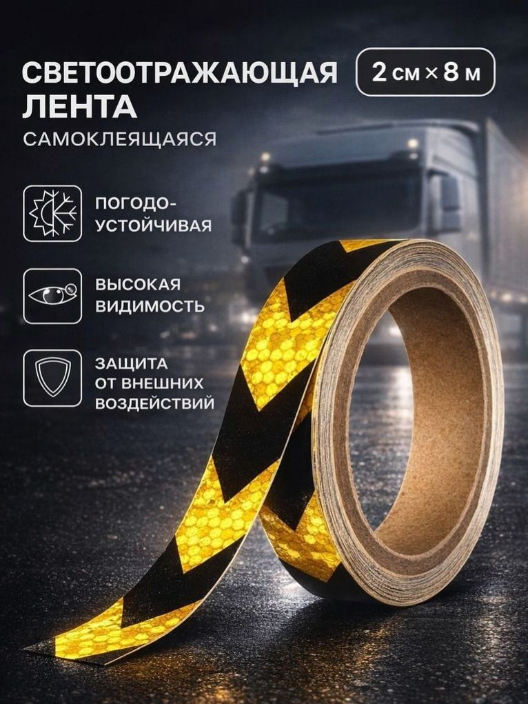 Светоотражающая лента самоклеющаяся TORSO, черно-желтая, 2 см x 8 м