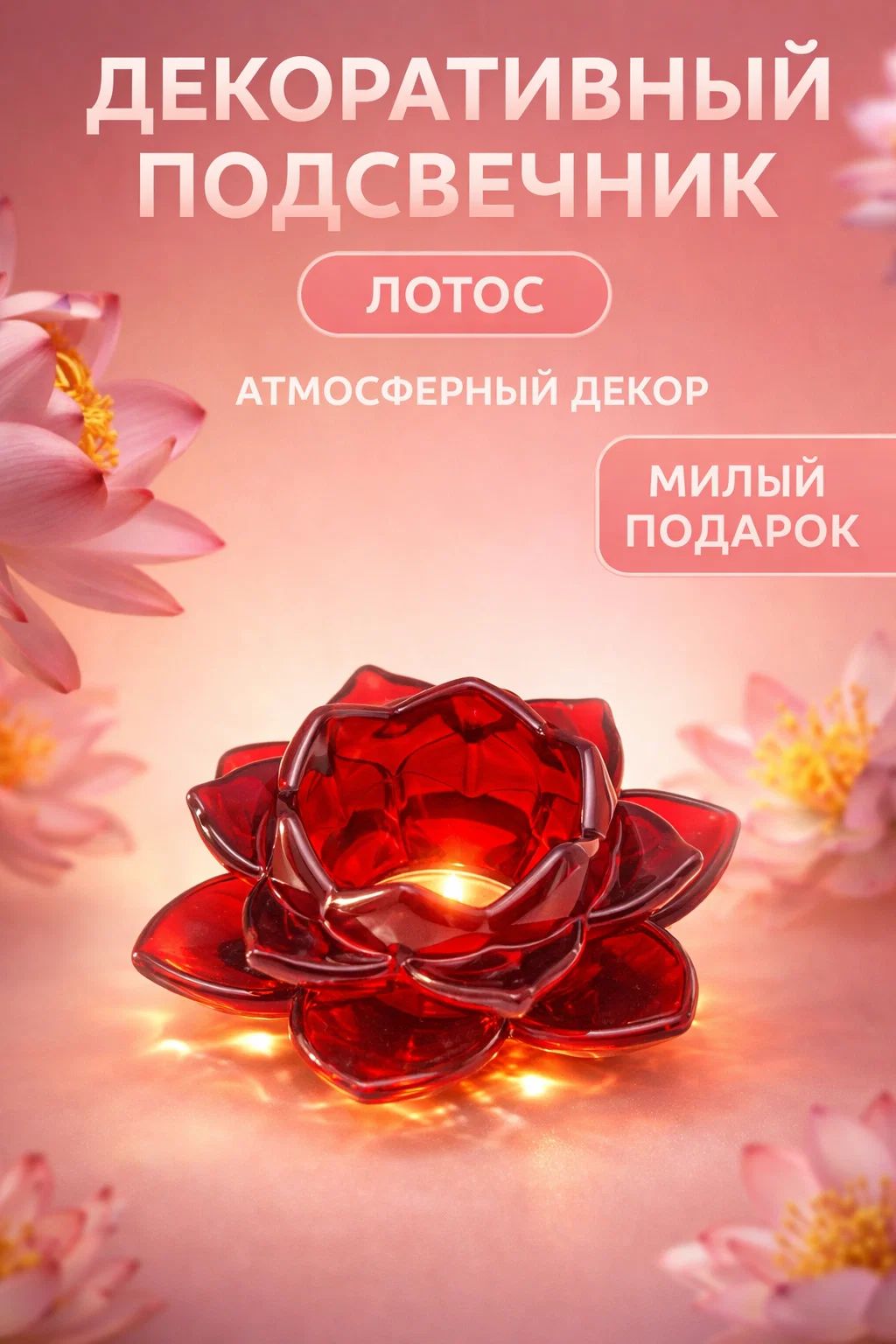 Стеклянный подсвечник на 1 свечу Лотос , красный, 5.5 10.5 10.5 см