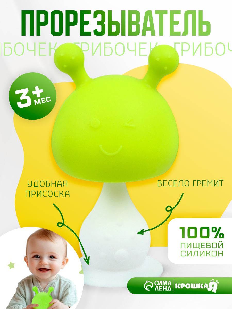 Прорезыватель силиконовый с погремушкой "Грибочек" / цвет зеленый / Крошка Я