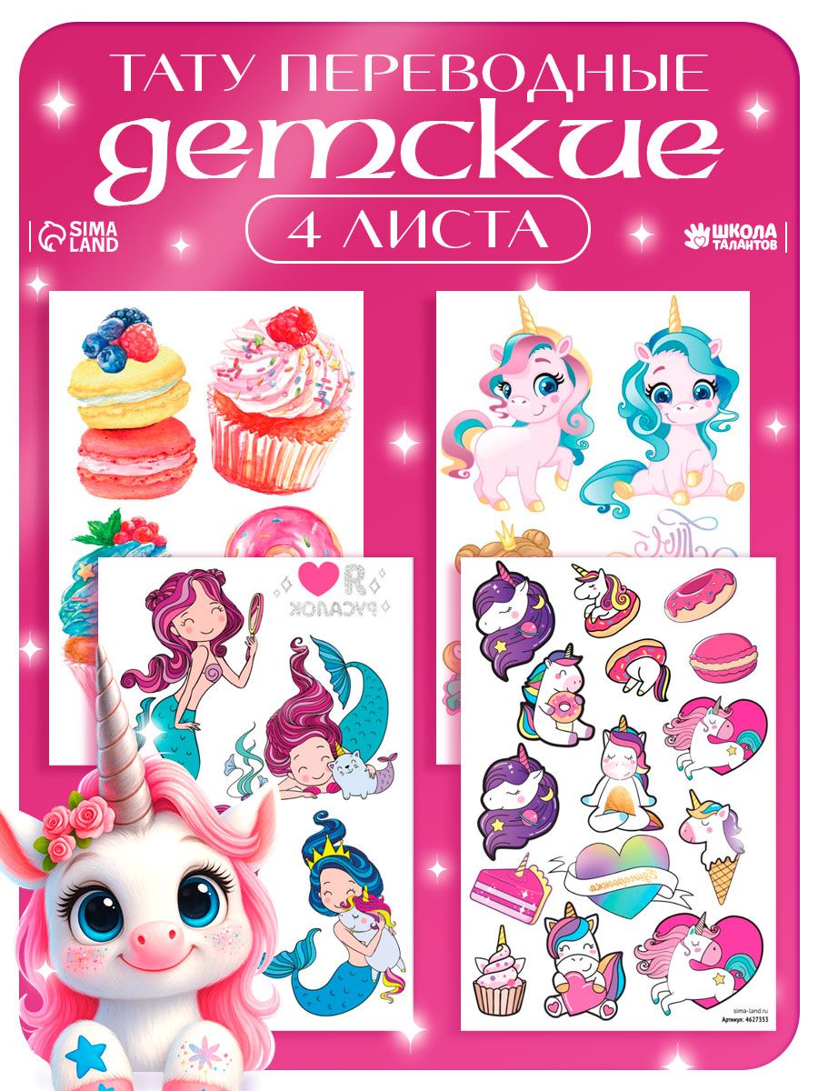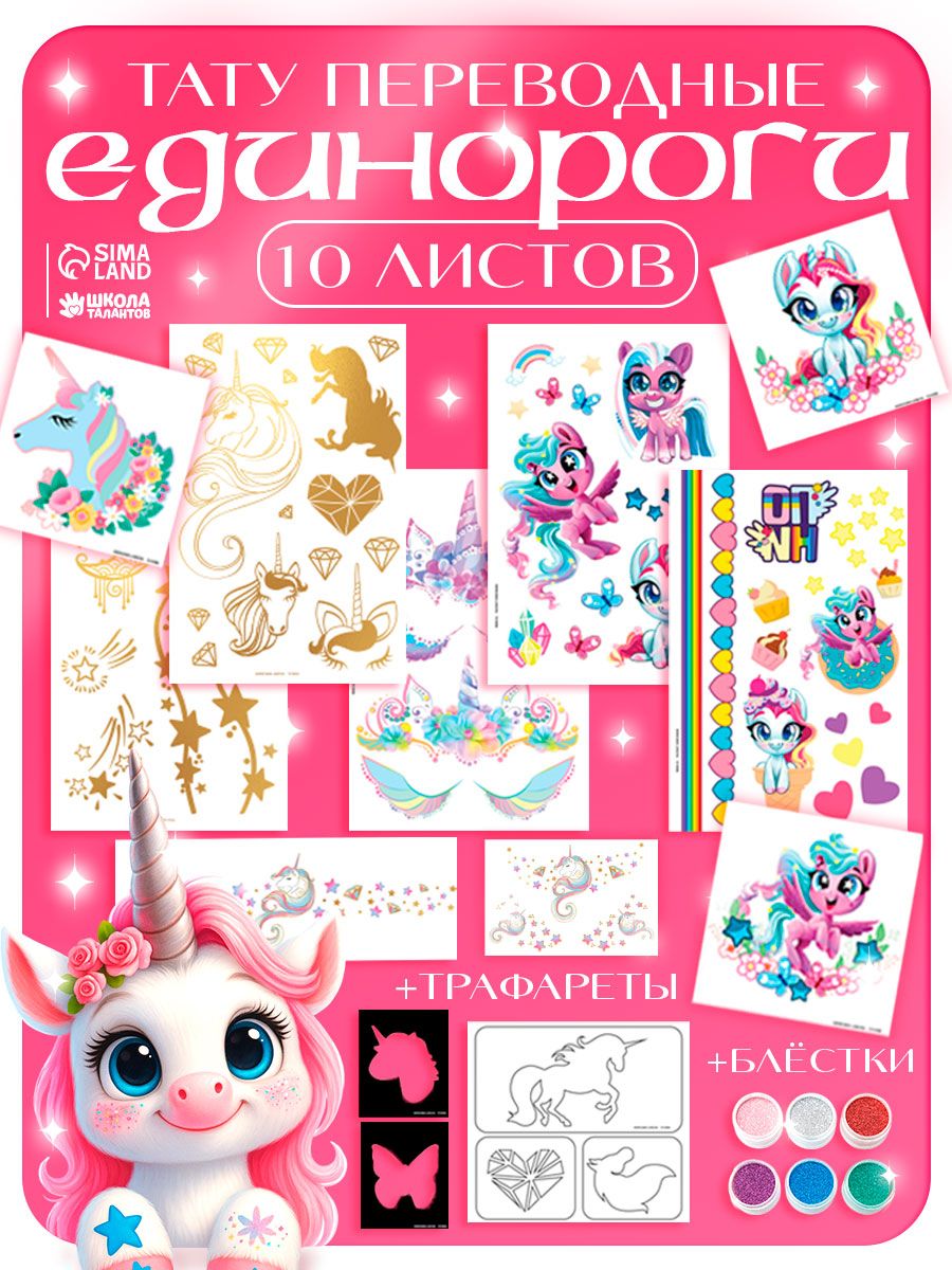 Переводные татуировки детские набор 8 листов, "Единороги", с трафаретами и блестками, детские татуировки для девочек