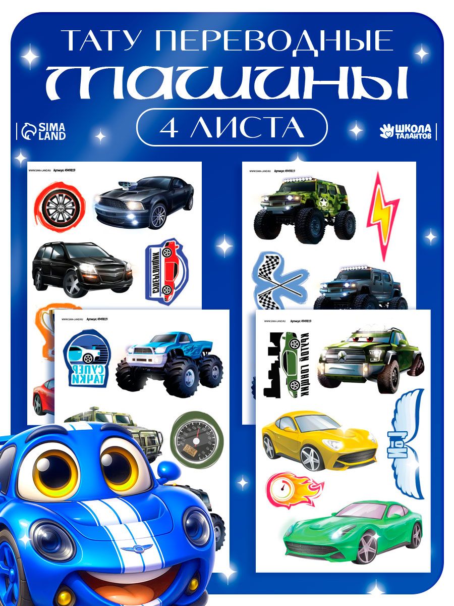 Переводные татуировки детские набор 4 листа, "Машинки", татуировки для мальчиков