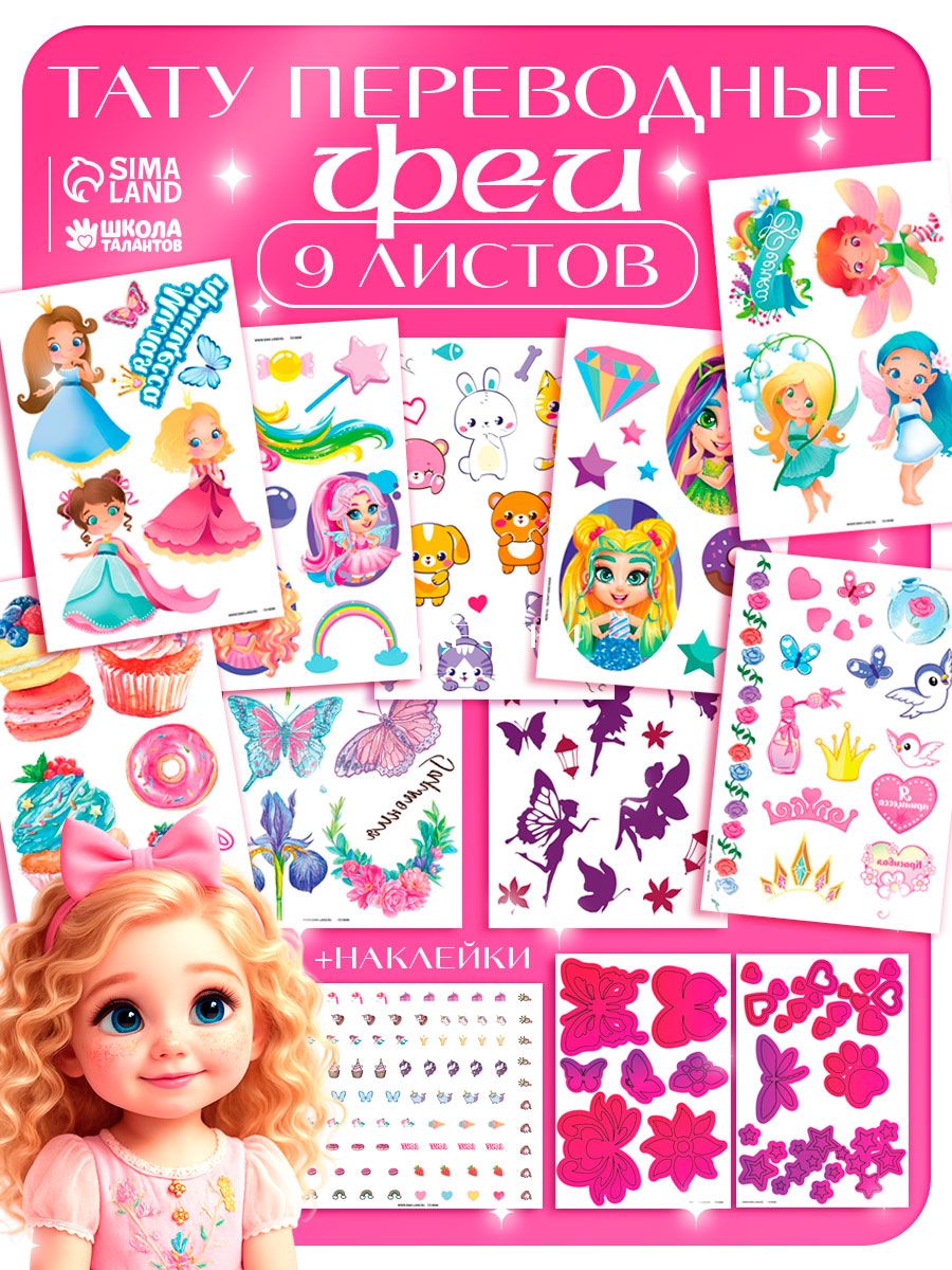 Переводные татуировки детские набор 11 листов, "Феи", с наклейками, детские татуировки для девочек