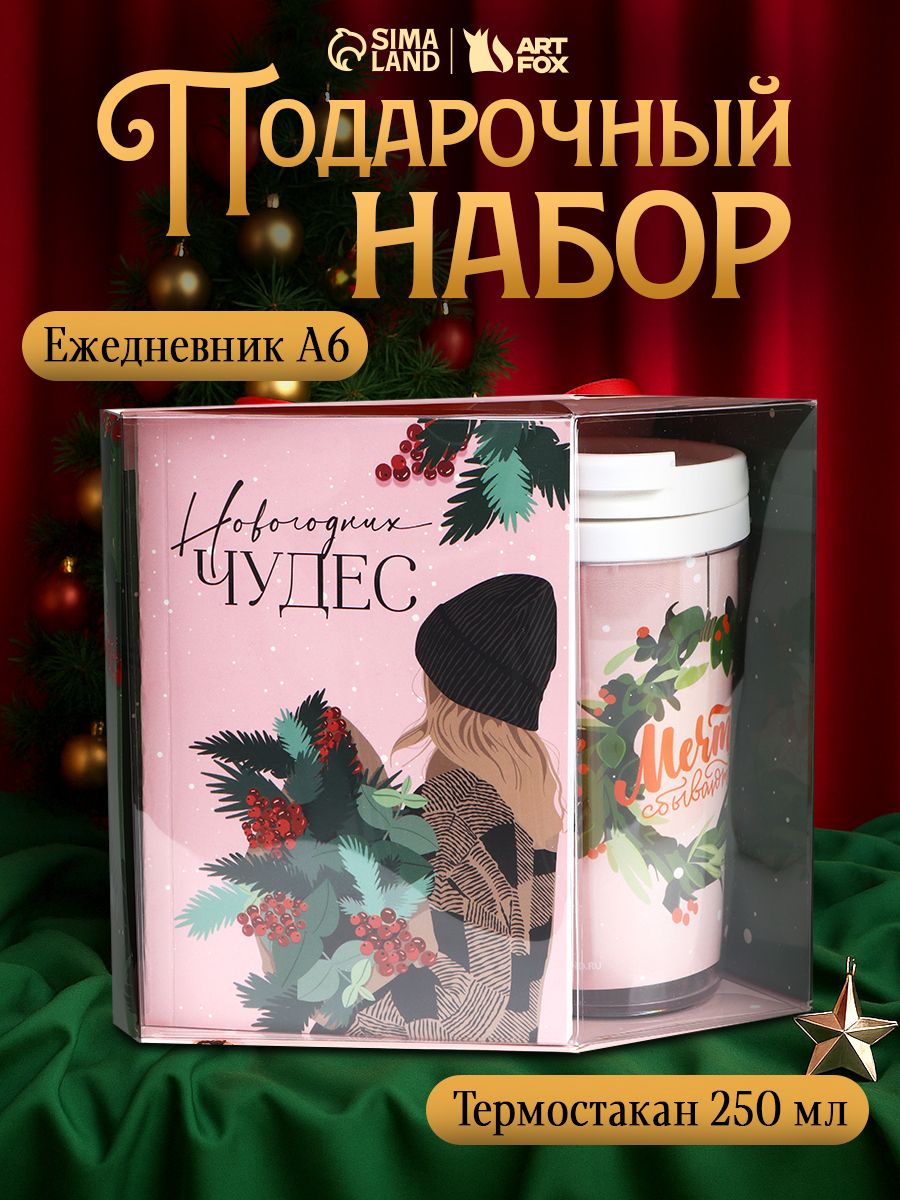 Подарочный набор новогодний: ежедневник А6, 80 листов и термостакан 250 мл, подарок на Новый год 2026