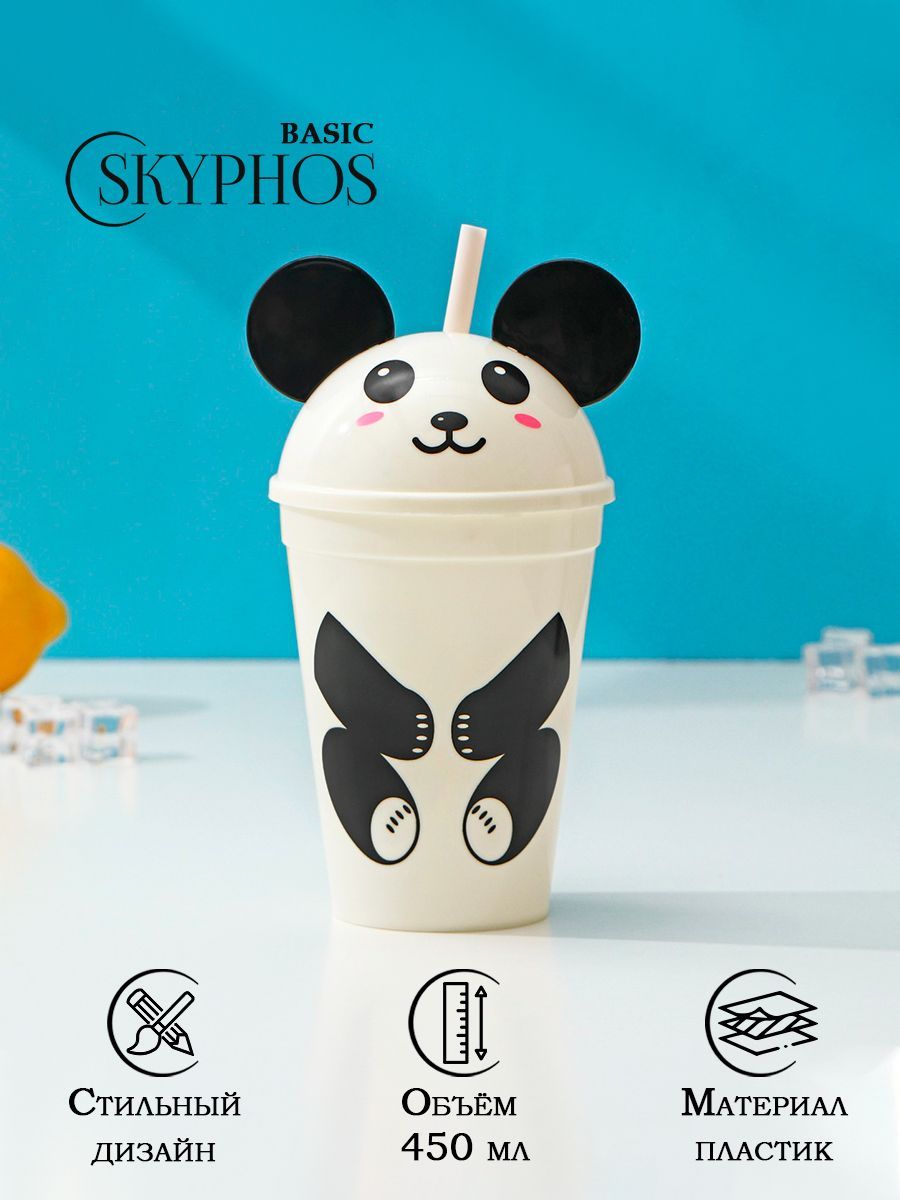 Стакан пластиковый с трубочкой и крышкой для напитков "Панда", цвет белый, 450 мл