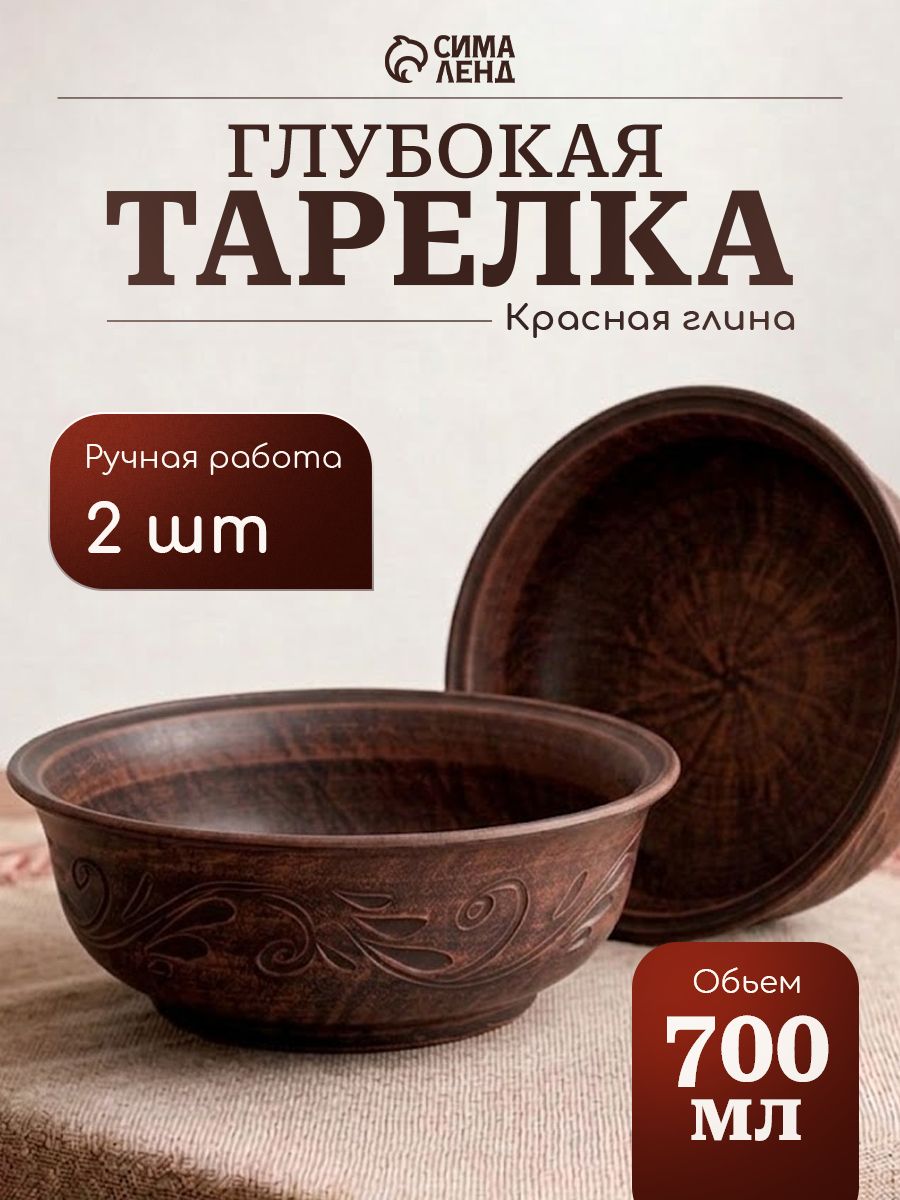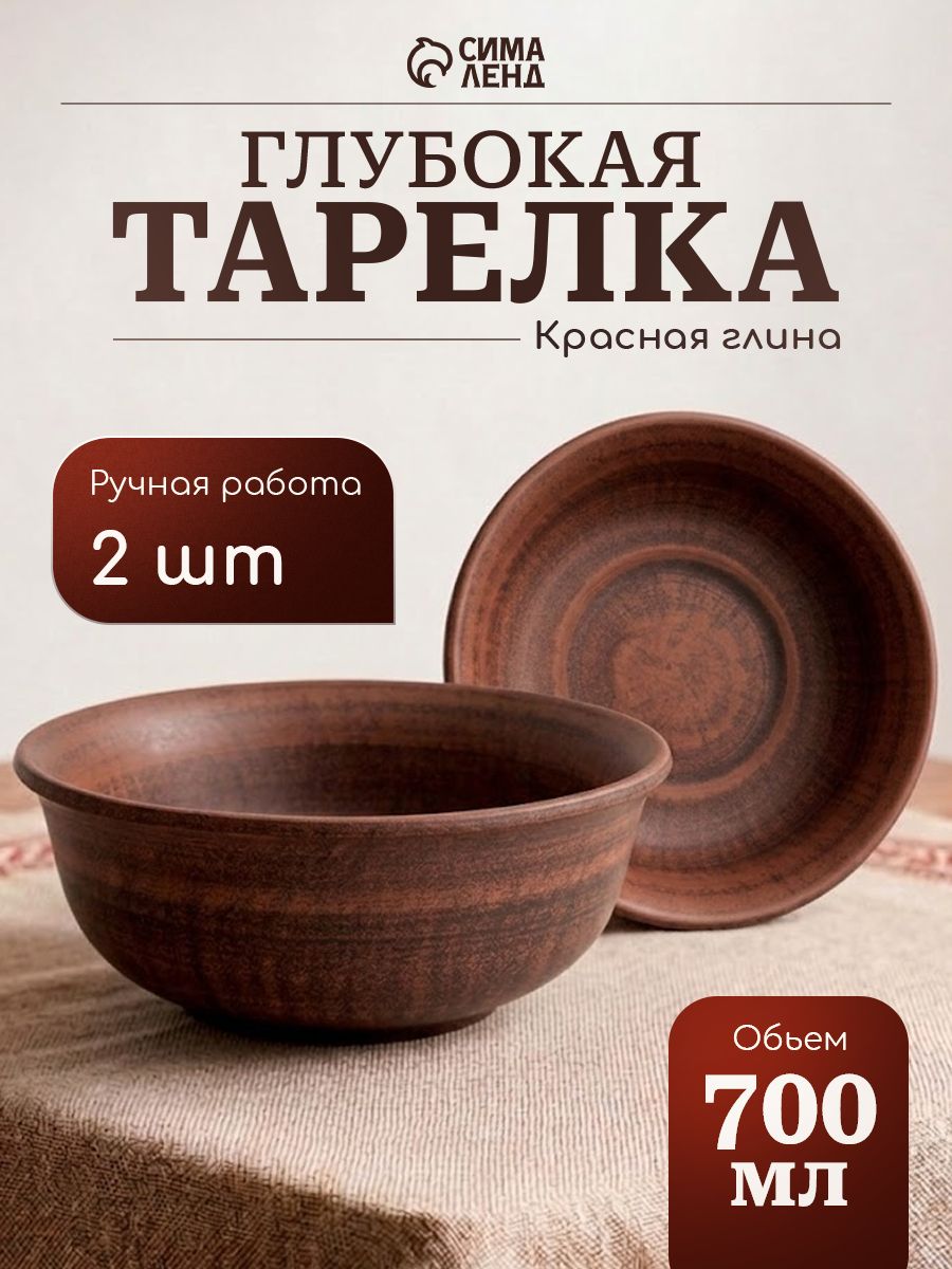 Тарелки глубокие, объем 700 мл, набор 2 шт, салатники, диаметр 18 см, красная глина "Гладкий"