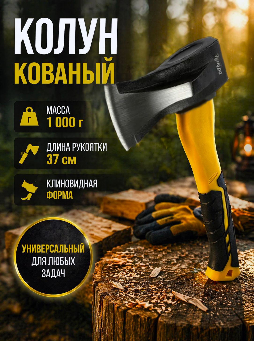 Колун для дров ТУНДРА ПРОФИ 1 кг, кованый, фиберглассовое топорище 37 см