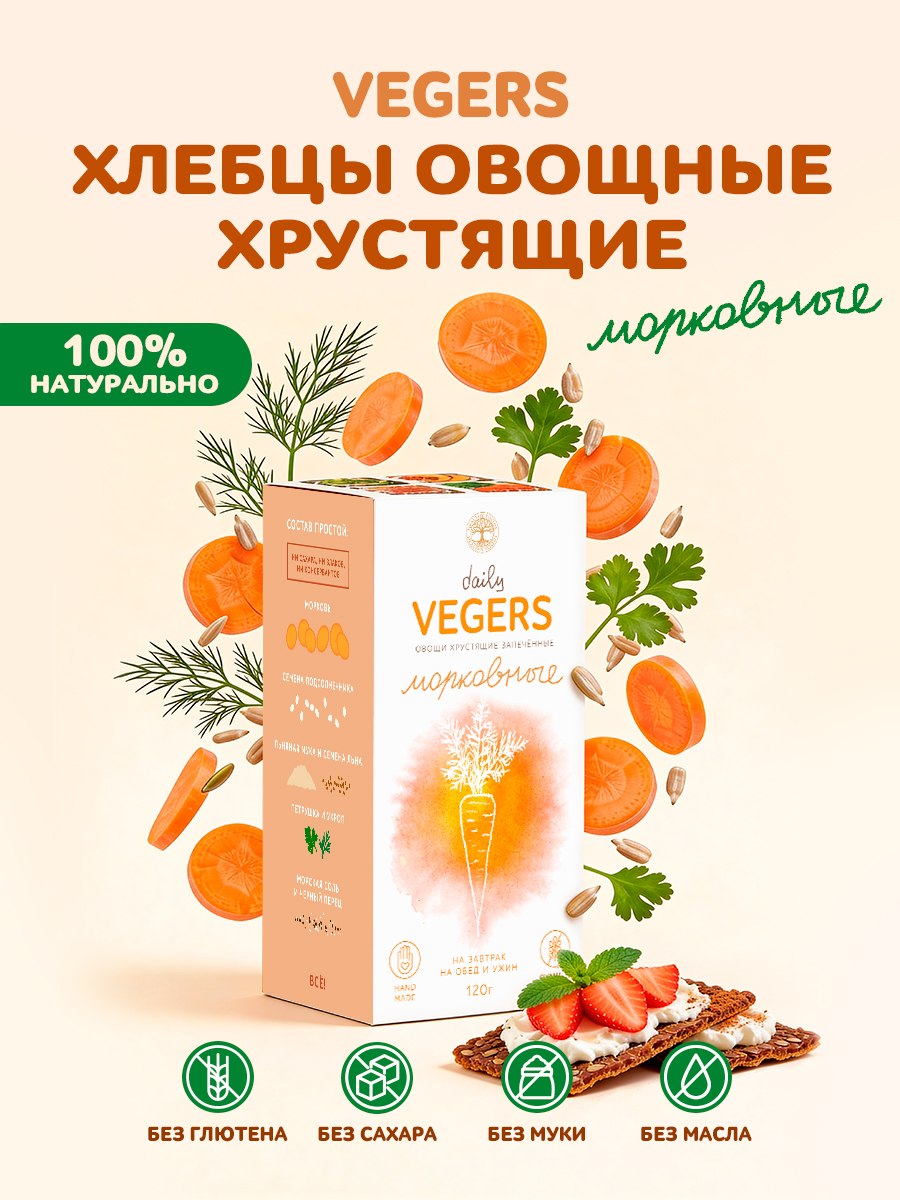Хлебцы Daily VEGERS без глютена овощные снеки, полезный перекус без сахара, морковные, можно в пост.