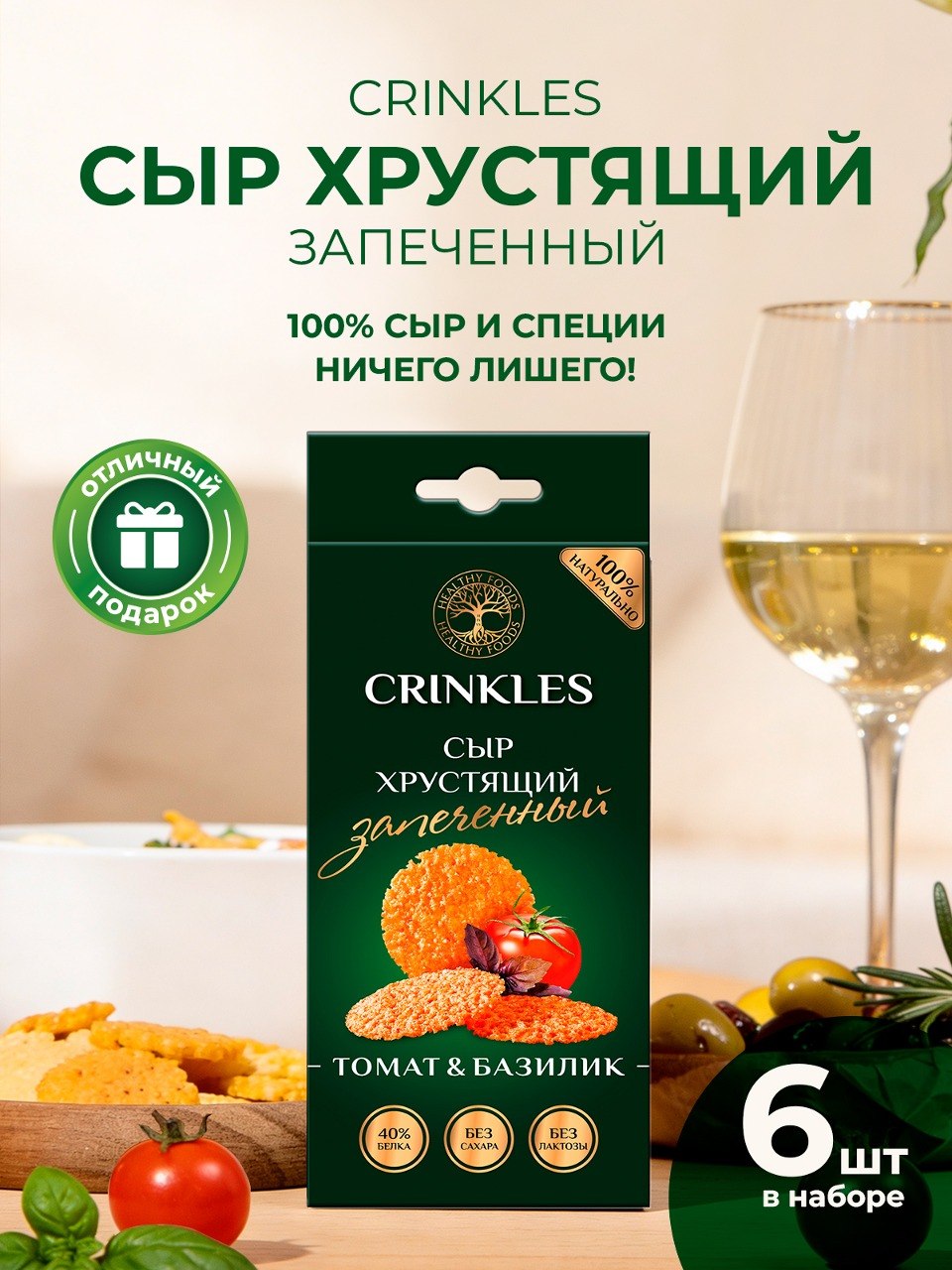 Чипсы Crinkles снеки из сыра хрустящие запеченные со вкусом томата и базилика.