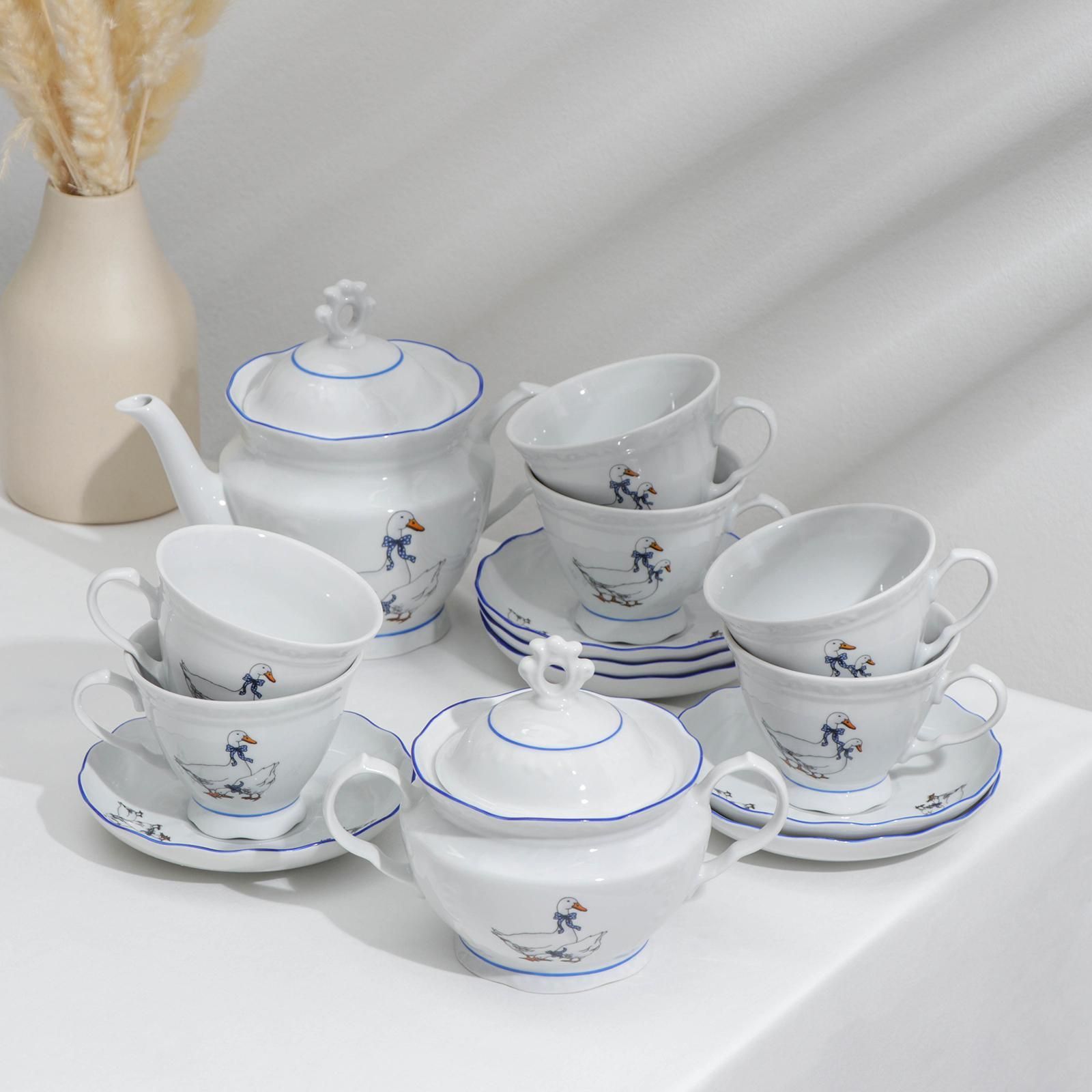Сервиз чайный Добрушский завод Гуси , 14 предметов: чашки 6 шт., блюдце 6 шт., чайник, сахарница, фарфор, белый