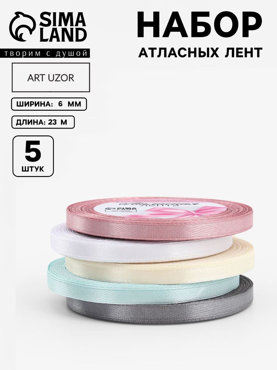 Лента атласная, набор 5 шт, 6 мм, 23 м, пастельная