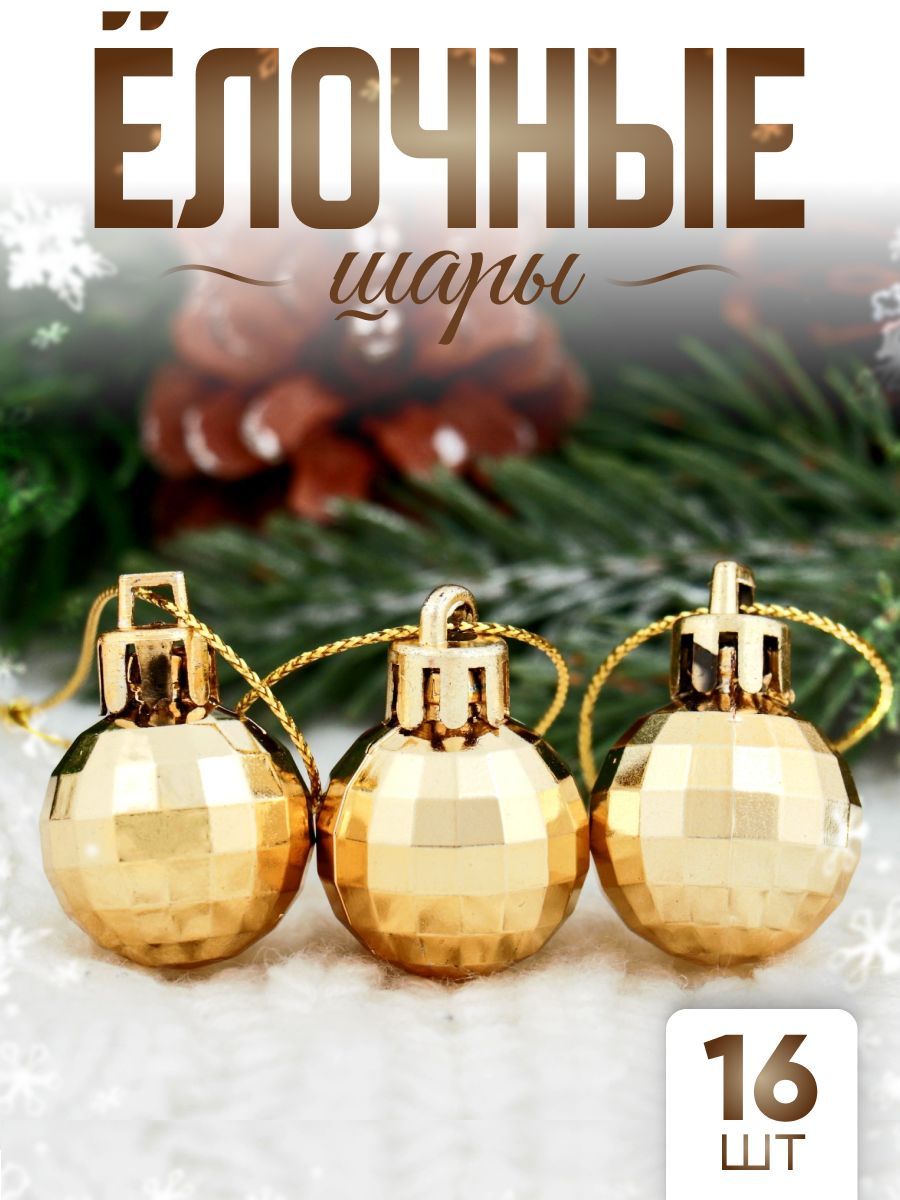 Елочные шары игрушки набор из 16 шт, 2,5 см, золотистые / Подвесные украшения на елку новогодние / Набор елочных украшений