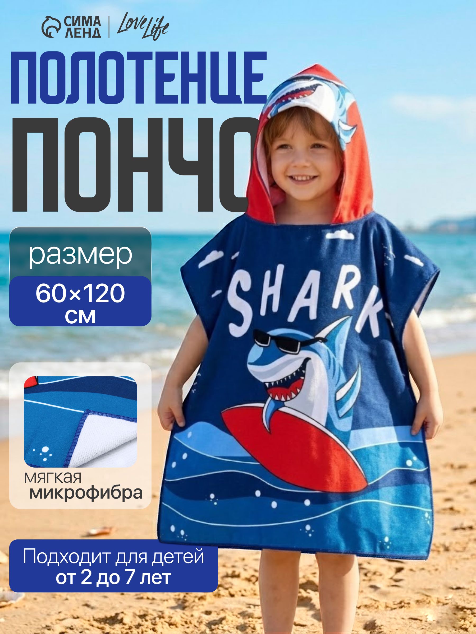Полотенце пончо детское 60х120 см, Акула