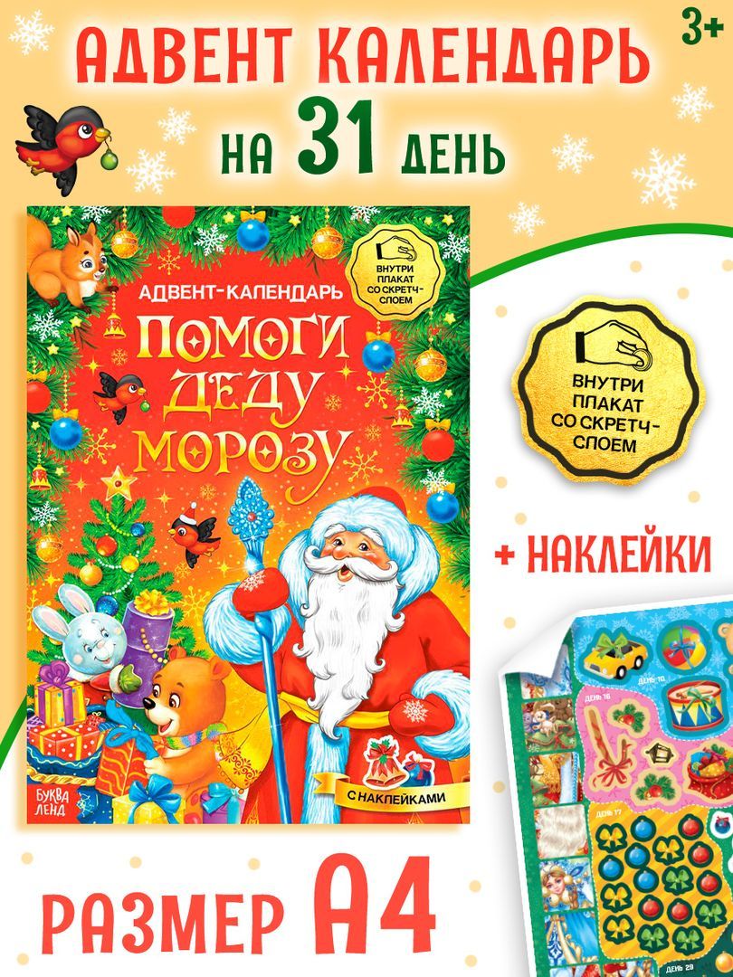 Адвент календарь новогодний, "Помоги Деду Морозу", скретч слой, наклейки для малышей, Буква-Ленд, книги для детей 3+